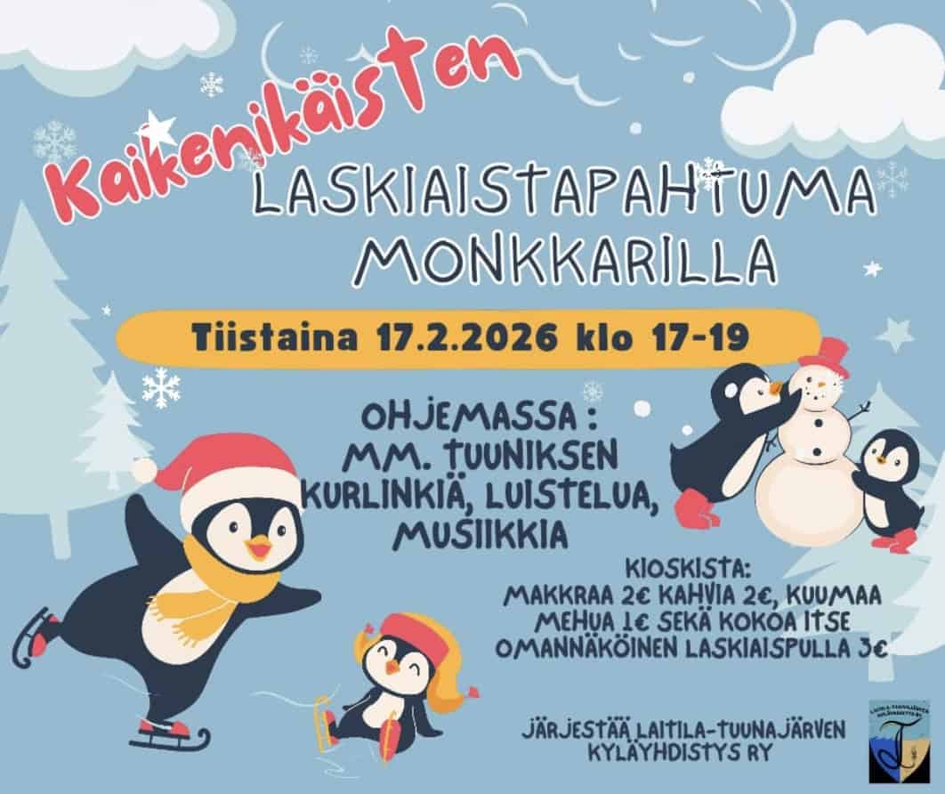 Laskiaistapahtuma kaikenikäisille tiistaina 17. helmikuuta 2026 kello 17-19 Tuunajärven monitoimitalolla. Tuunajärventie 1002.